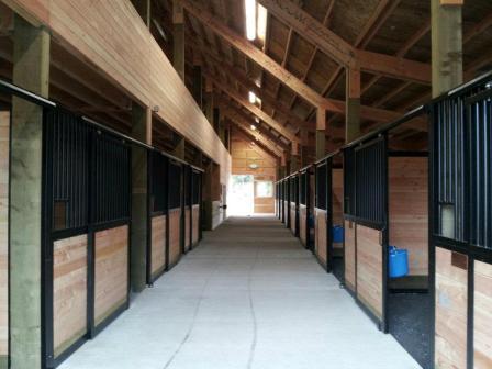 In our barn we have a hot wash rack, tack-room, heated bathrooms and an heated office/tack-room. Boarders each have a locker available to store tack and personal items. Stall have a dutch door and window to the outside as well as a sliding door on the inside giving access to the 12 foot aisles. Our barn is very well ventilated and light. Without the arena attached to the barn it keeps the dust levels down, ensuring clean air for our horses.
